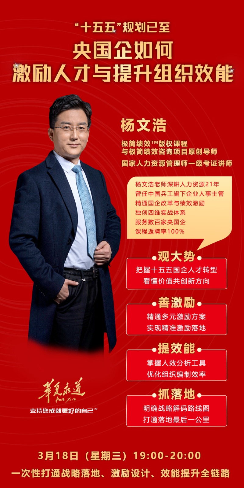 随着“十五五”规划落地推进,国有企业改革深化提升行动迈入攻坚关键期,在国家明确提出要发挥科技创新、产业控制、安全支撑三大作用的时代背景下,央国企作为国家战略科技力量的核心载体,其人力资源管理正面临从“总量扩张”向“结构适配”的根本性转变。如何以人才激励破局、以组织效能赋能,成为支撑科技创新、产业控制、安全支撑三大核心作用的关键命题。在此背景下,华夏永道大讲堂聚焦央国企人力资源激励与组织效能提升方面,特邀深耕央国企人力资源领域21年的杨文浩老师。于3月18日(星期三)19:00-20:00,为身为央国企组织发展(OD)负责人、绩效薪酬主管等人力资源管理从业者的您带来《“十五五”规划已至,央国企如何激励人才与提升组织效能?》直播课。用一线实战沉淀的方法论,给你可落地、可执行、合规性强的执行方案。