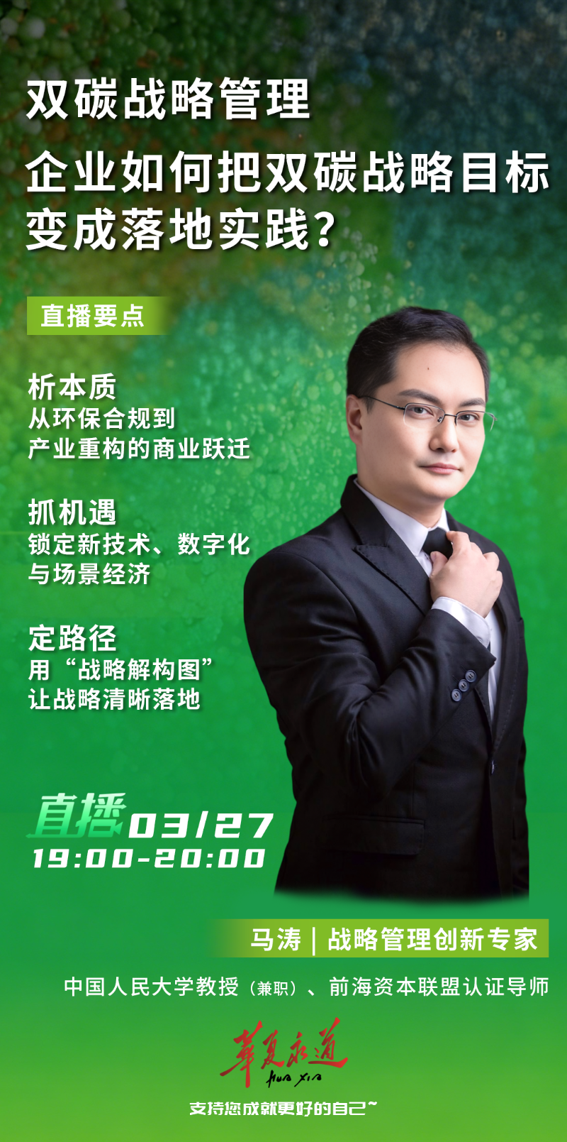 如何从被动应对转向主动布局?碳约束,究竟是企业的紧箍咒,还是新增长的发动机?如何在“十五五”政策深水区,找到属于自己企业的绿色赛道?3月27日晚19:00,华夏永道特邀战略管理创新专家马涛老师,为企业董事长、总经理等企业核心管理人员带来《双碳战略管理:企业如何把双碳战略目标碳变成落地实践?》主题直播,为您打通从“愿景”到“结果”的战略梗阻。