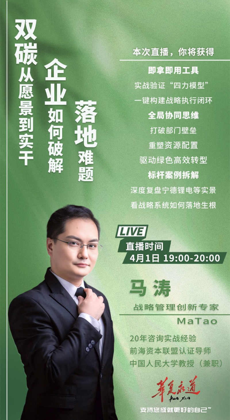 4月1日19:00-20:00,华夏永道特邀拥有20年咨询实战经验的马涛老师,他将基于其独创的战略执行协同系统——四力模型,面向企业董事长、总经理等中高层管理者,尤其是正在推进或规划绿色转型、双碳战略的企业决策团队。深度拆解企业如何在双碳背景下,实现从战略构想到绿色成果的高效转化,并结合宁德锂电新能源产业园等标杆案例,为您呈现一套可复制的资源整合与协同机制。